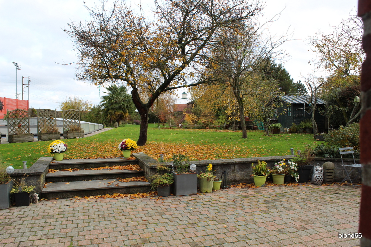 Au milieu du jardin les bouleaux et acer explosent en orange.