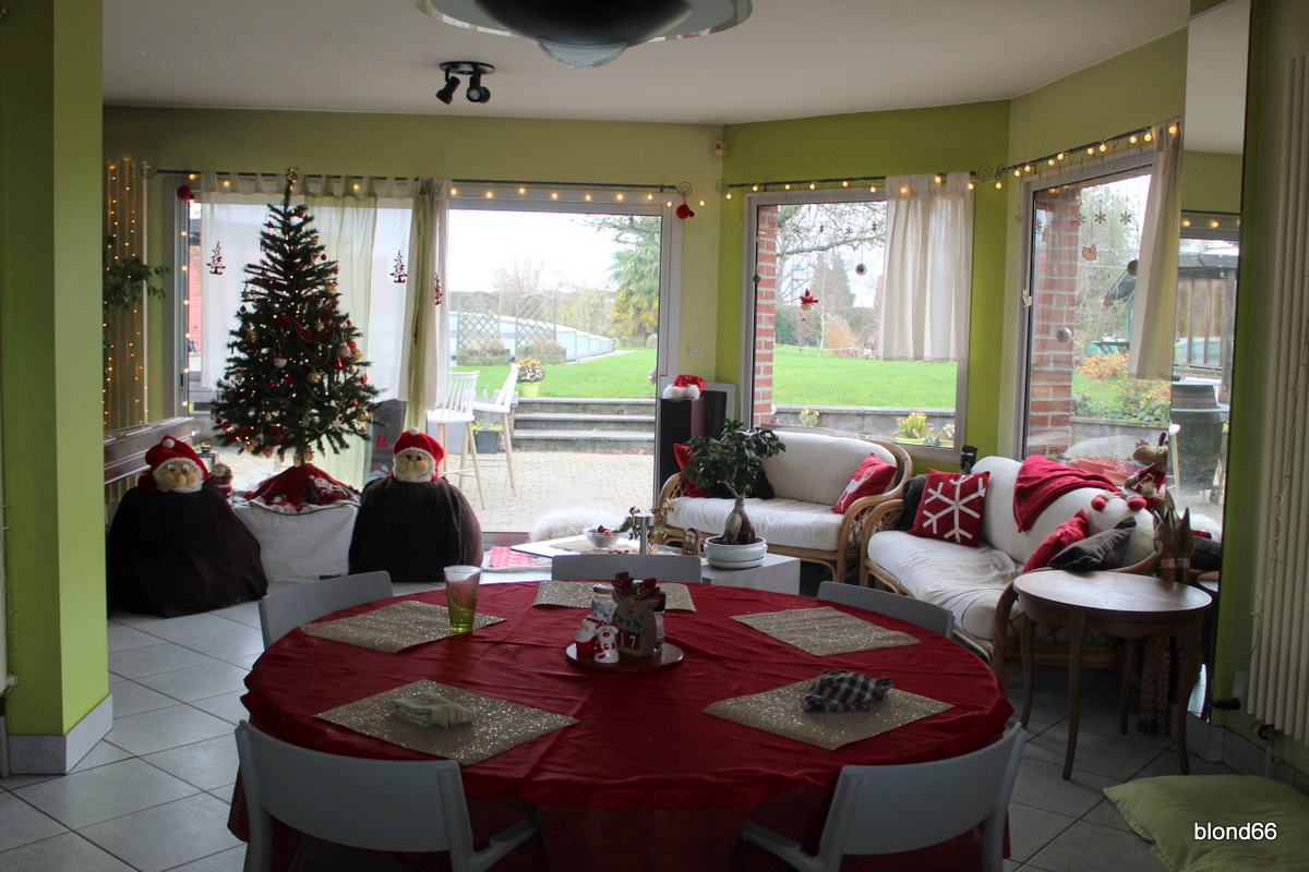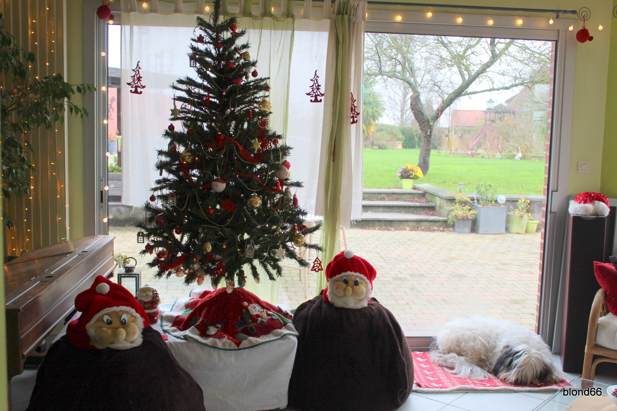 2 gros Pères Noël accompagnent le sapin. Opka retrouve avec plaisir son tapis de Noël.
