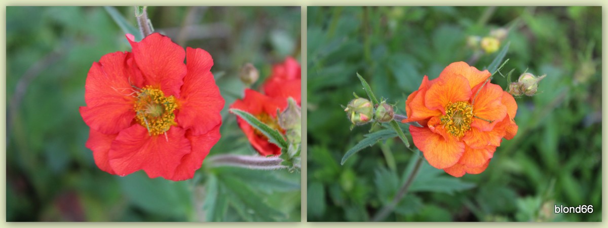 Les geums démarrent leur floraison. D’abord « Fiery Tempest » avec ses fleurs rouge écarlate, puis « Scarlet tempest » rouge-orangé.