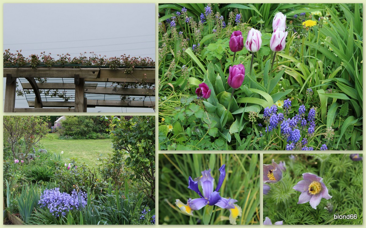 Les petites tulipes « Lilac Wonder » sont revenues plus nombreuses. Et la belle clématite « Picotee » se fait remarquer.