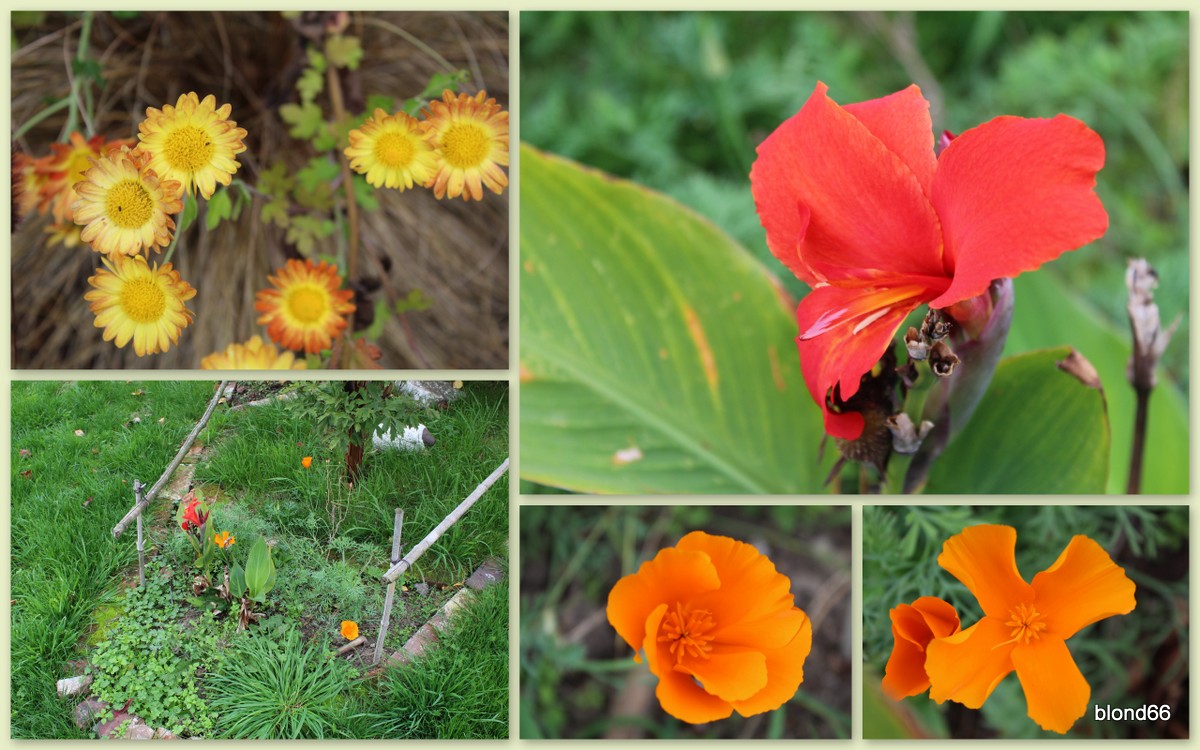 Le chrysanthème « Dernier soleil » anime le milieu du massif et au bout, les couleurs éclatantes de la fleur de canna et des pavots de Californie