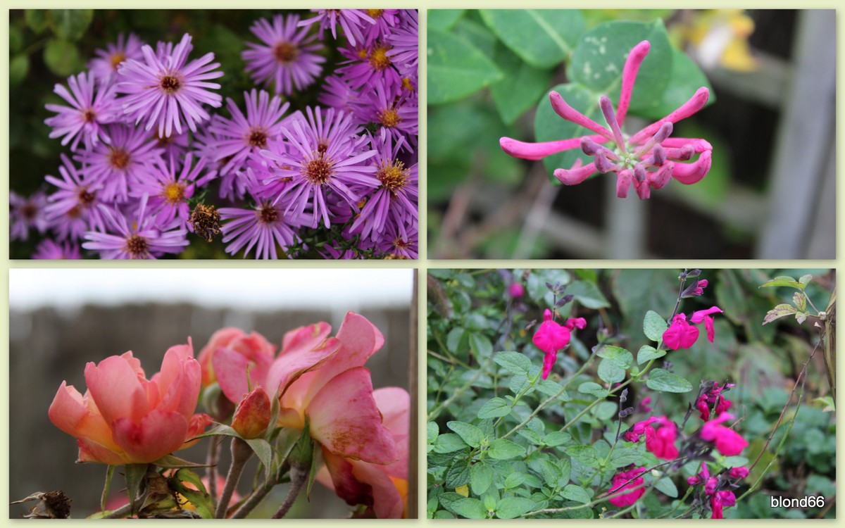 Plus loin, un autre aster rose s’est installé près du Lonicera « American Beauty », la sauge « Dayglow » et les roses de « Royal de Radan ».