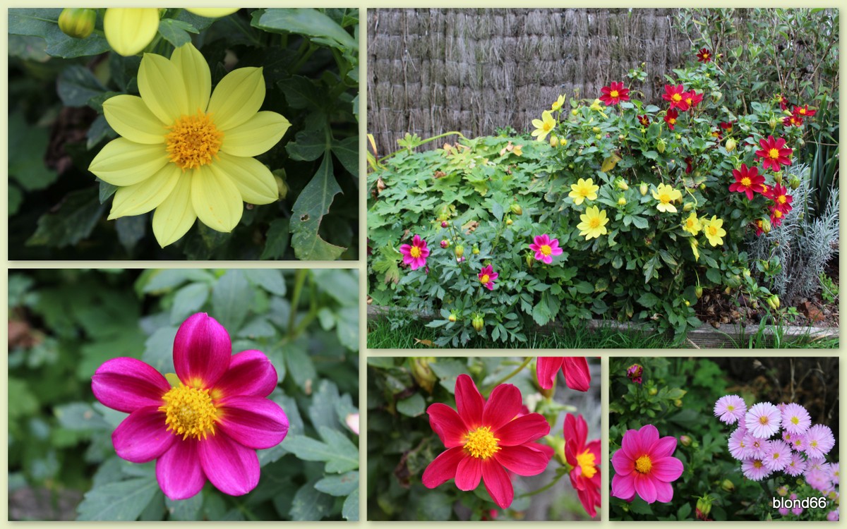 Des dahlias, restés en place et même un bébé semis (rigolo, il lui manque 1 pétale sur chaque fleur), et des asters.