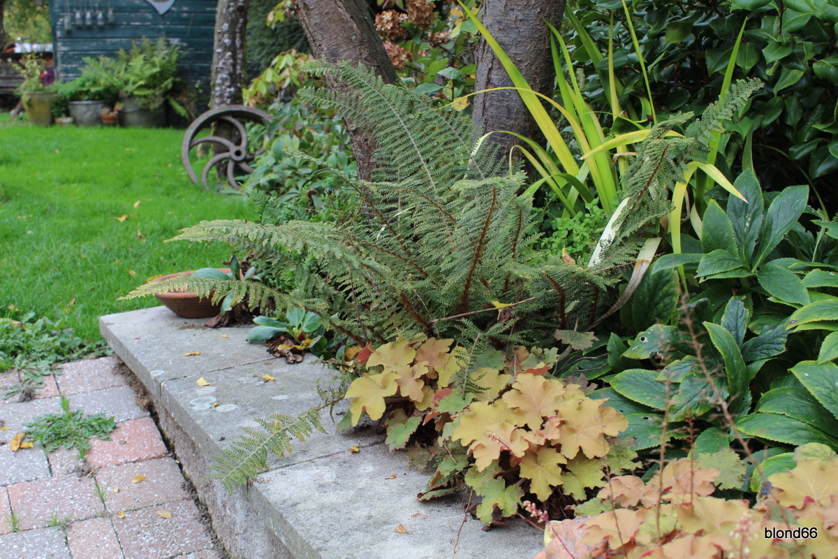 J’aime bien l’ambiance avec la fougère Polystichum setiferum « Herrenhausen » et l’iris « Paul’s Gold ».
