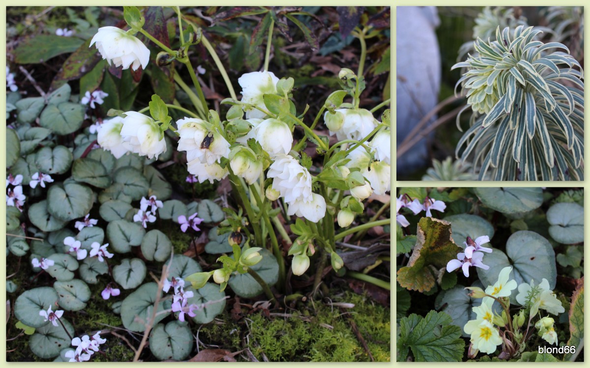 Hellebore, euphorbe, cyclamen coum (pas blanc, mais au feuillage gris) et primevères (jaune pâle).