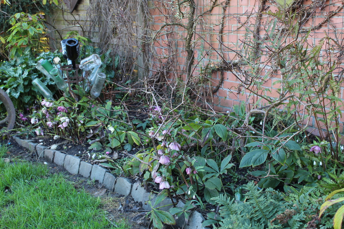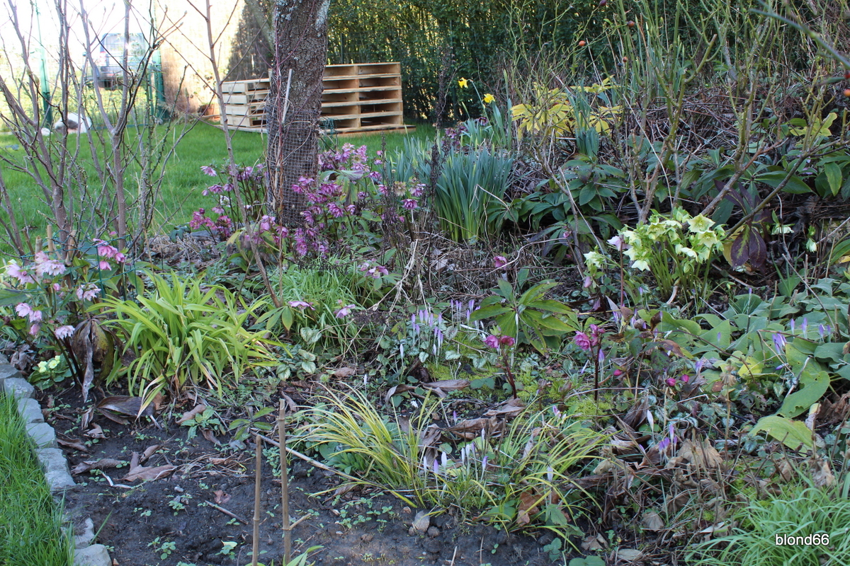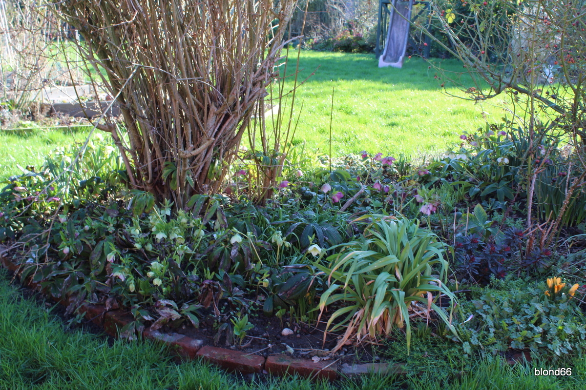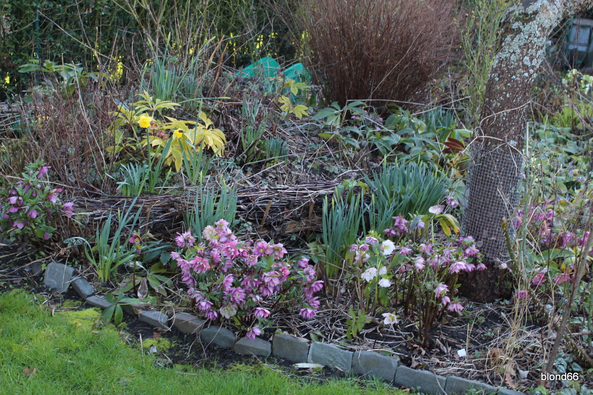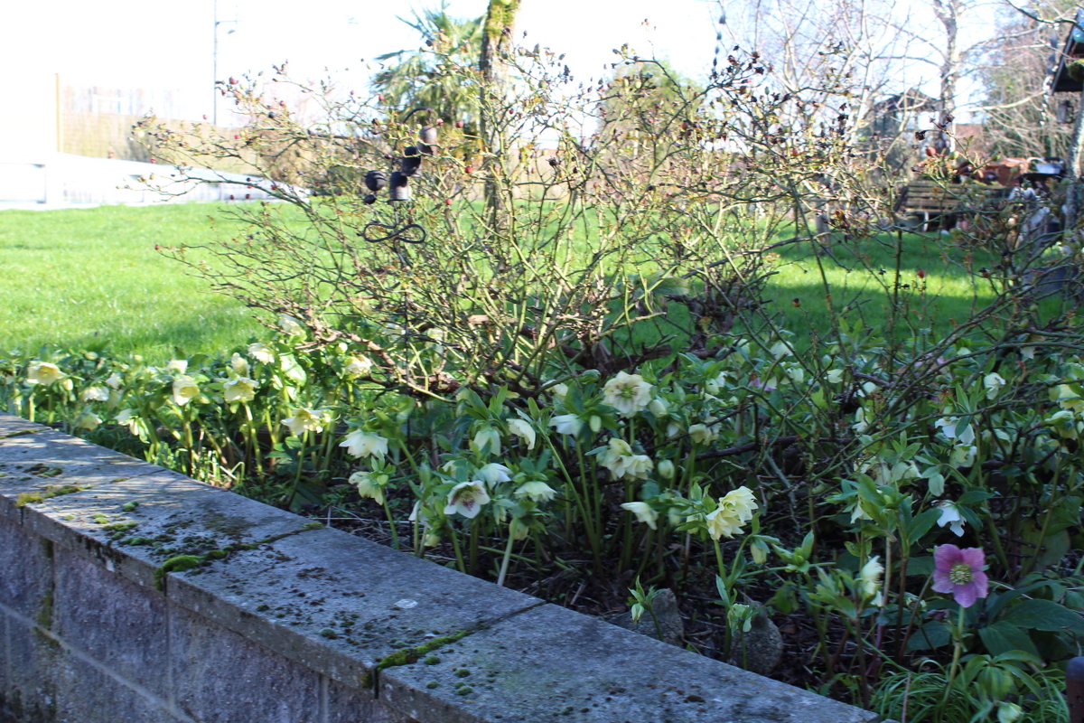 Le long de la haie se colore aussi avec les hellebores, principalement roses.