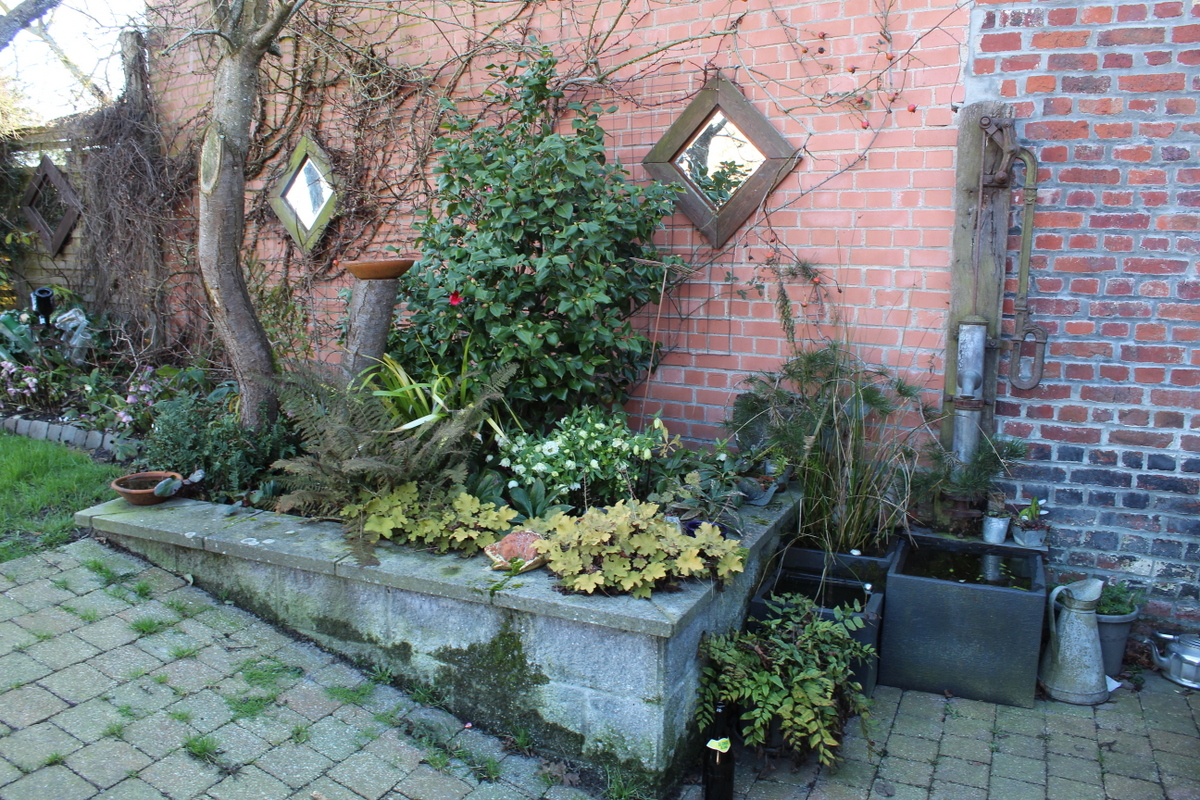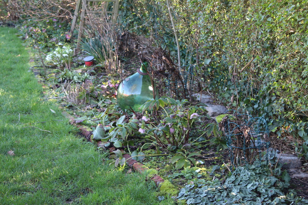 Le massif semble au repos. Mais de près, l’hellebore double saumon planté au printemps 2025 nous offre une fleur.