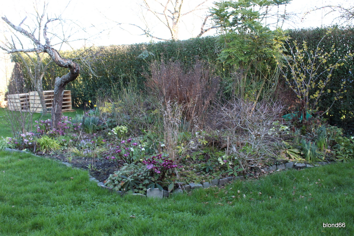 Ici aussi, des hellebores viennent animer le massif en blanc, en attendant le magnolia stellata.
