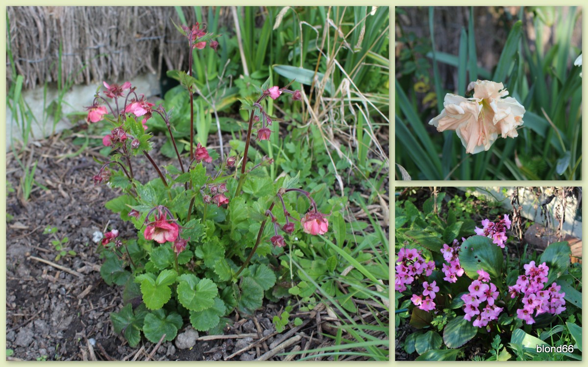 Geum « Tempo Rose », bergenia rose et narcisse « Apricot Whirl » apportent de la couleur.