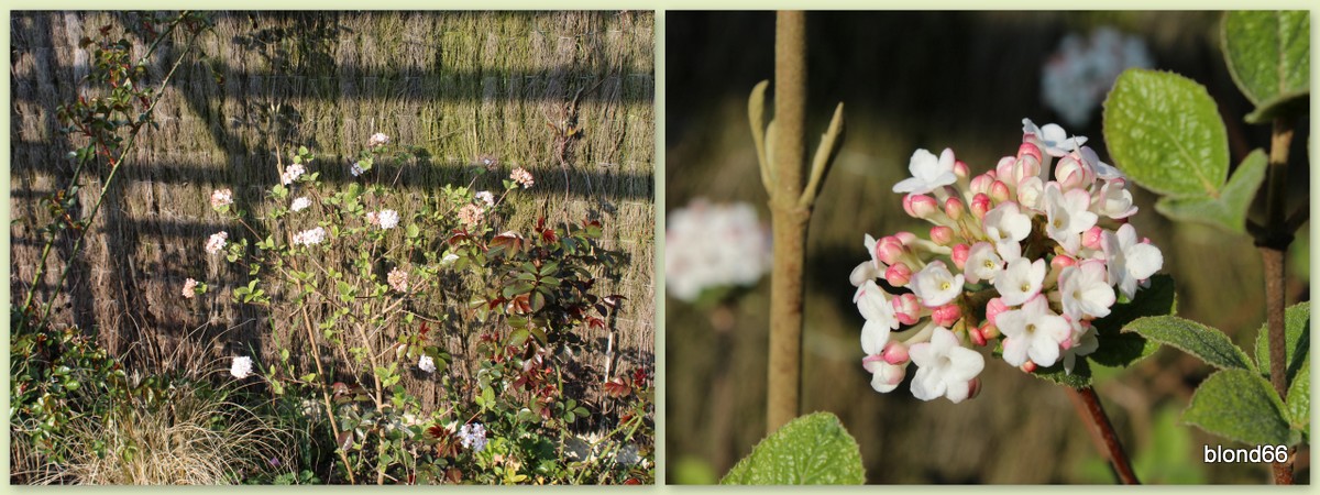 Puis c’est le Viburnum « Aurora » qui attire avec ses fleurs en boule rose et blanche et son parfum.