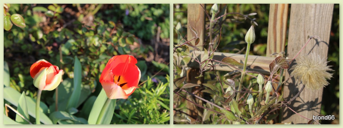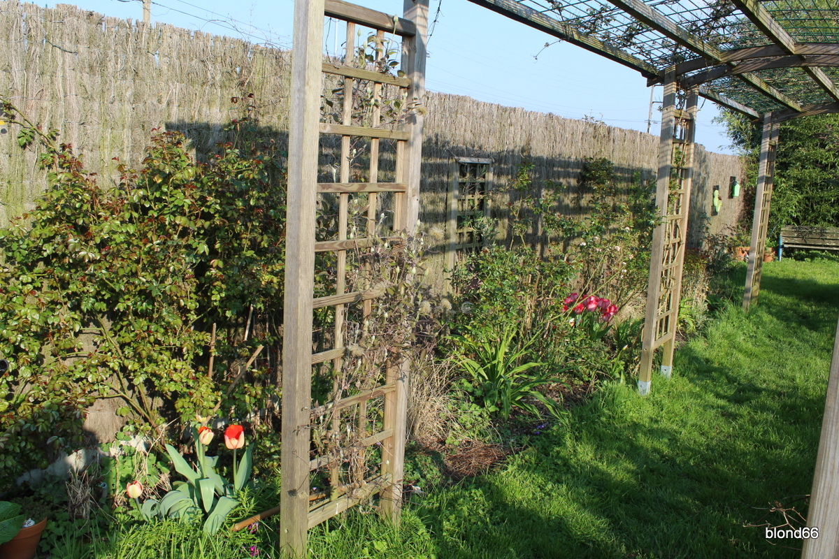 Au pied de la tonnelle, quelques tulipes « Mystic Van Eijk » attirent l’oeil. Et sur la tonnelle, les clématites se préparent.
