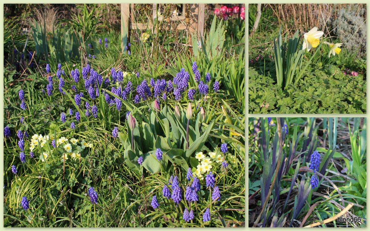 Il faut se pencher pour profiter de la couleur des muscaris, jonquilles, primevères et feuillage bleu d’un iris.