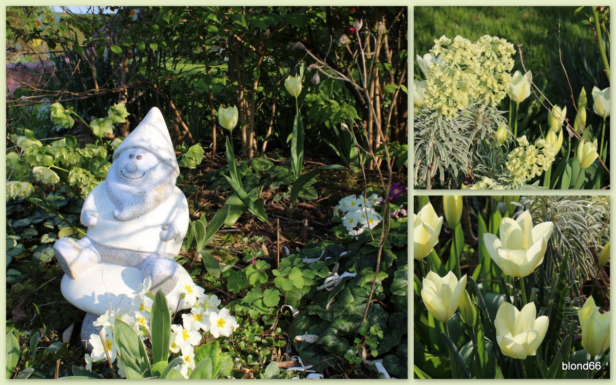 A ses pieds, le blanc ou presque blanc s’installe avec les primevères, les tulipes « Purissima » installée en 2013 et l’euphorbe »Tasmanian Tiger »