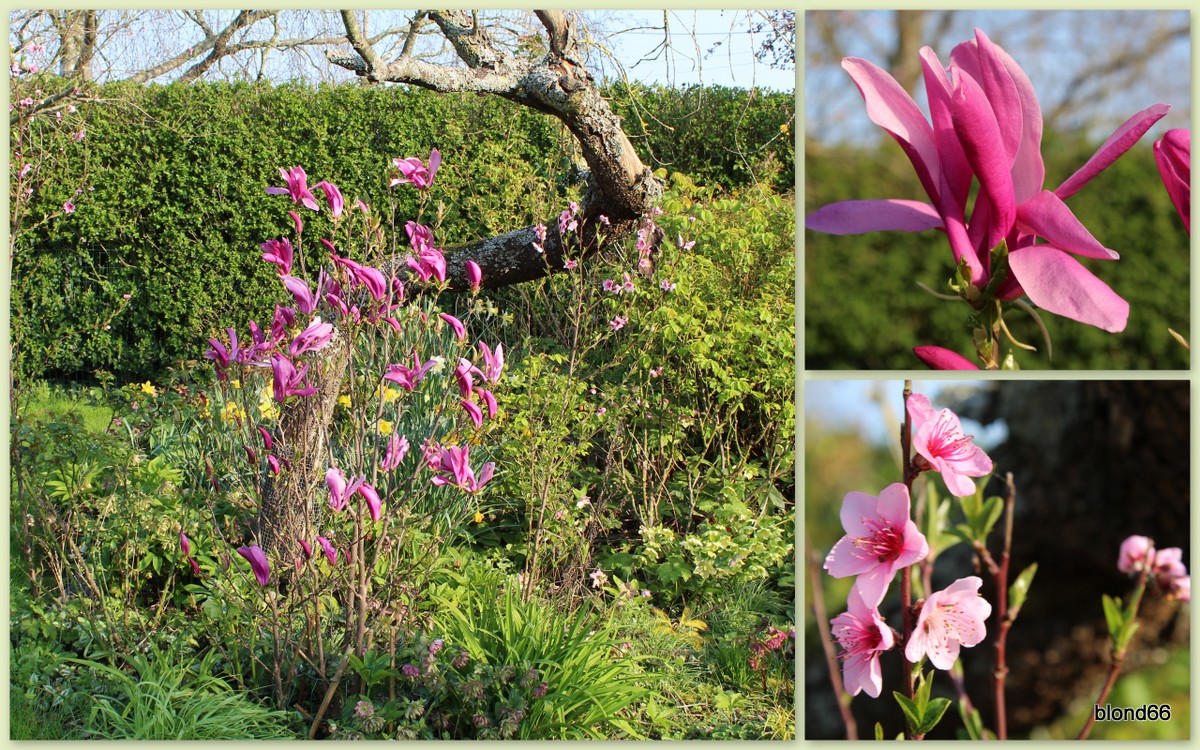 Au premier plan, le magnolia « Susan » nous offre ses fleurs aux pétales roses foncés en extérieur et plus clair en intérieur, accompagné par les fleurs d’un jeune pêcher.