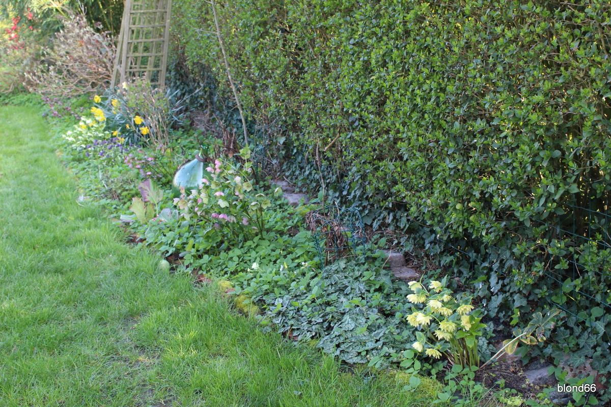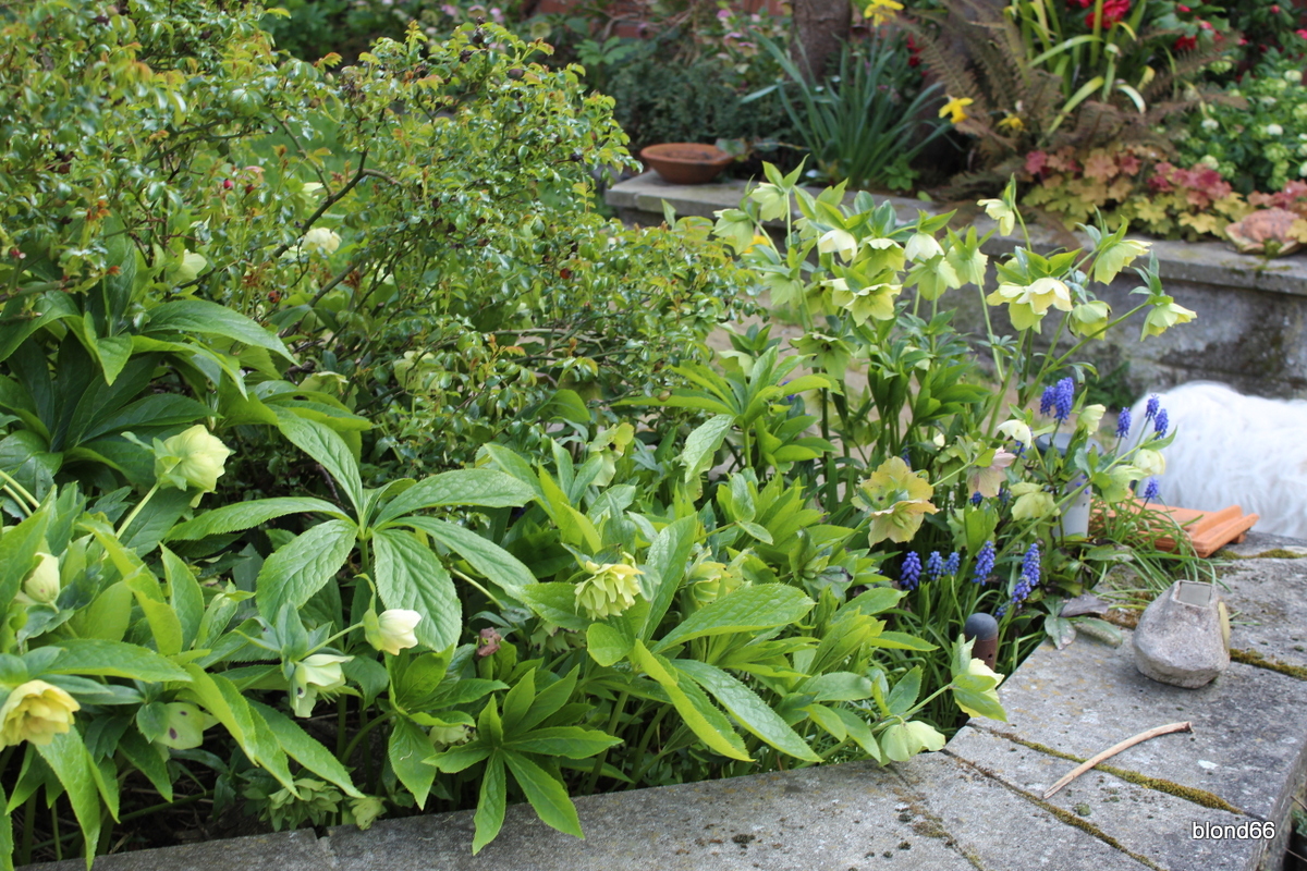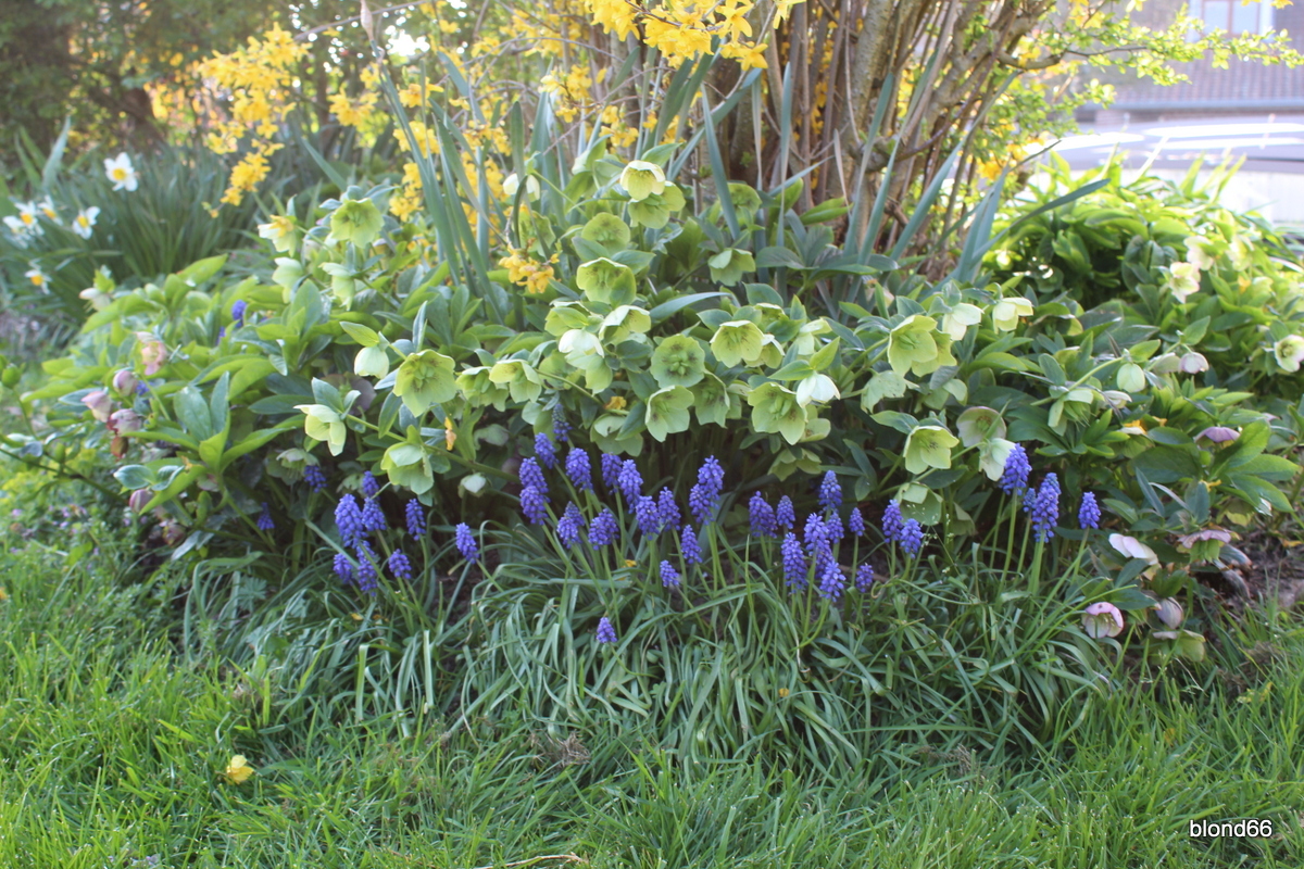 Carré Gauche est toujours couvert d’hellebores jaunes. Et les muscaris viennent ajouter du bleu.