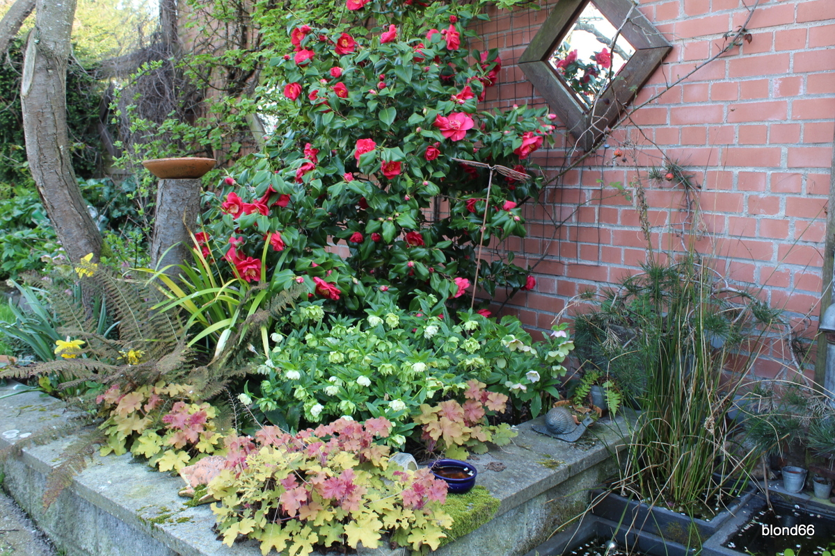 Les couleurs explosent du coté de Carré Droit avec le camélia, les hellebores et l’heuchère « Caramel ».