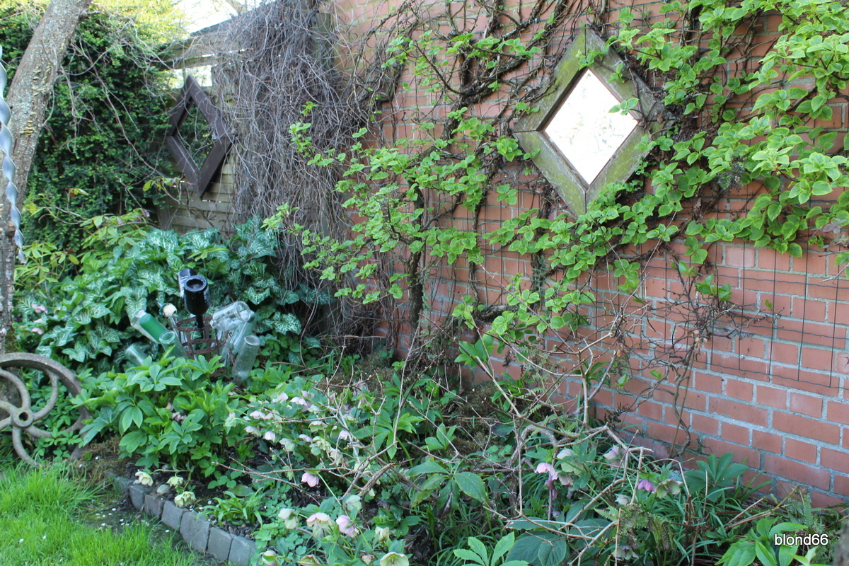 Au Sous-Bois, les hellebores roses couvrent le sol. Sur le mur, l’hydrangea petiolaris nous offre son feuillage vert tendre.