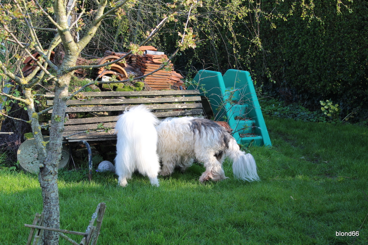 Je suis attendue. Les chiens trouvent que je suis longue à faire mon tour alors ils m’attendent au bout du jardin.