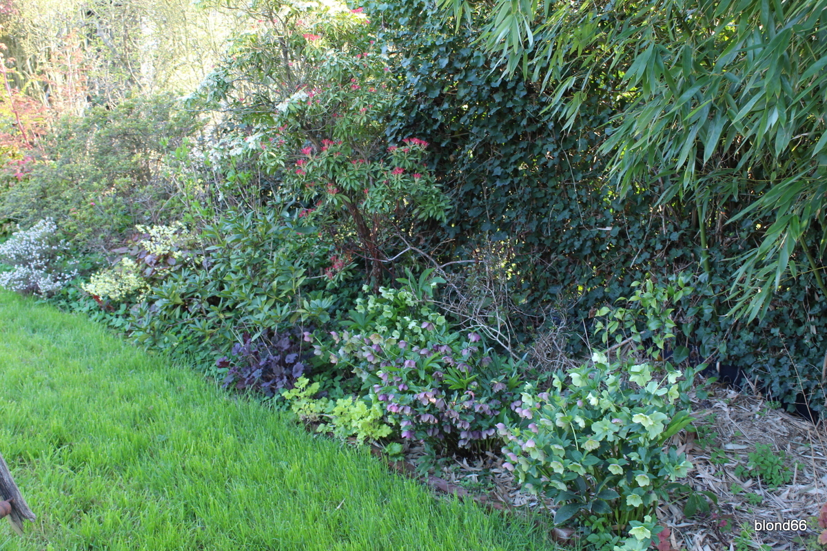 Le pieris commence sa floraison en blanc et son feuillage en rouge et, à ses pieds, hellebores et heuchères font le spectacle depuis un moment.