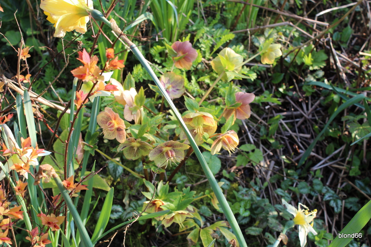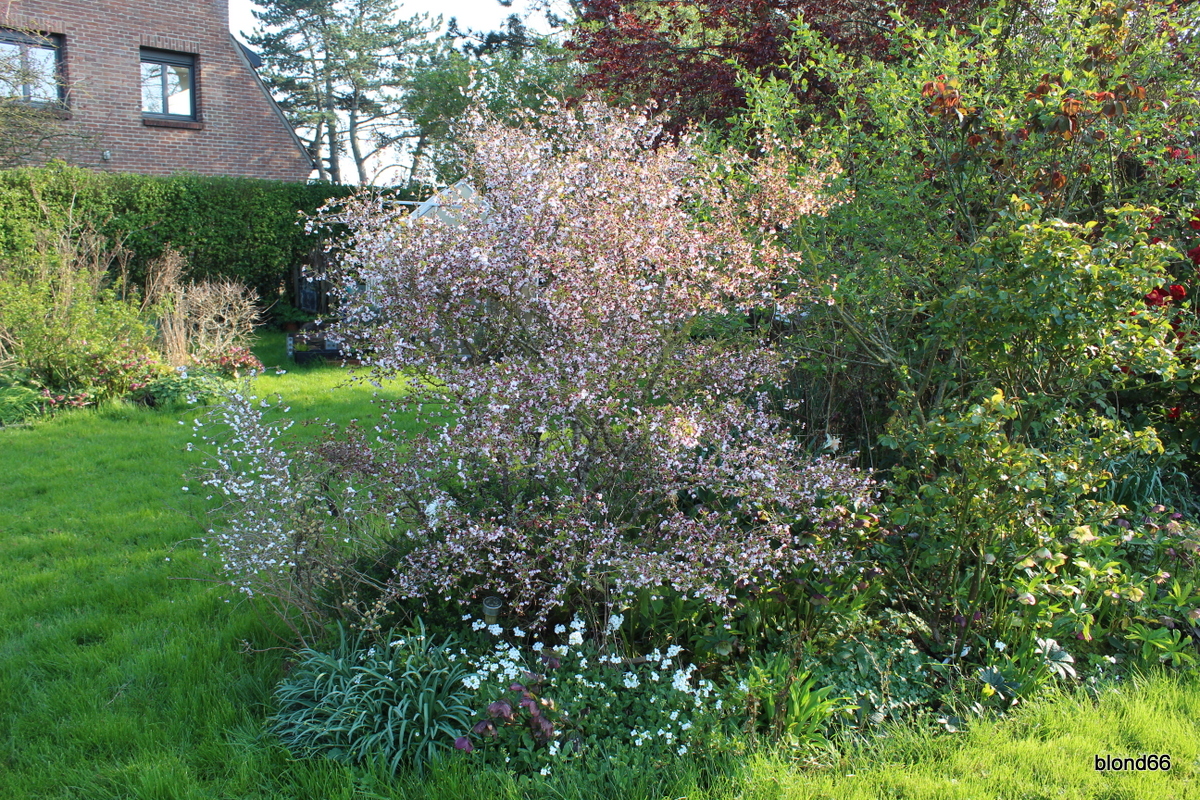 Le massif du Seringat est couvert d’hellebores blancs, rouges. Et devant, c’est le prunus « Kojo no mai » qui termine sa floraison.