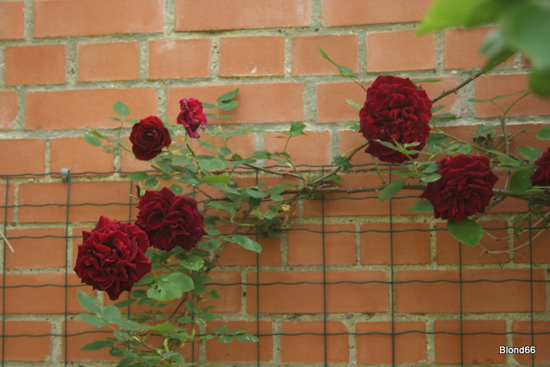 mai "Caramel" tient la vedette au pid du rosier rouge qui fleurit