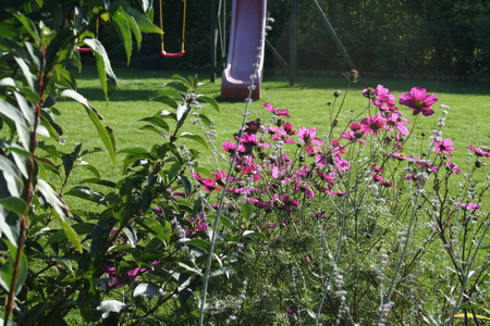 D'un coté du massif, les cosmos annuels tiennent compagnie
