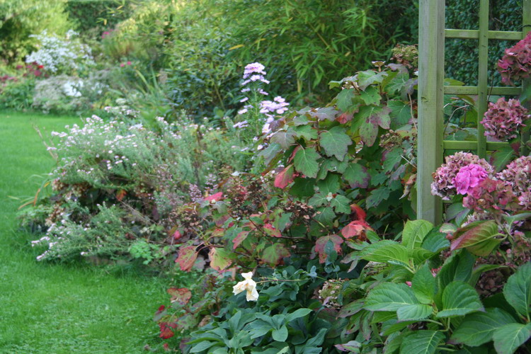 | Plus loin, l'hydrangea quercifolia prend de belles couleurs |
