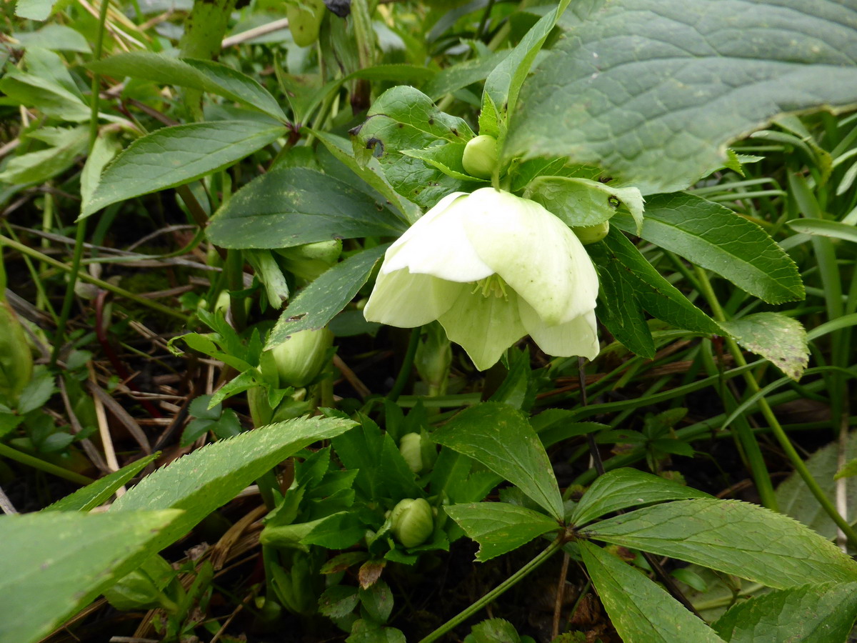 Le long de la haie, sous l'hydrangea quercifolia, l'hellebore commence sa floraison |