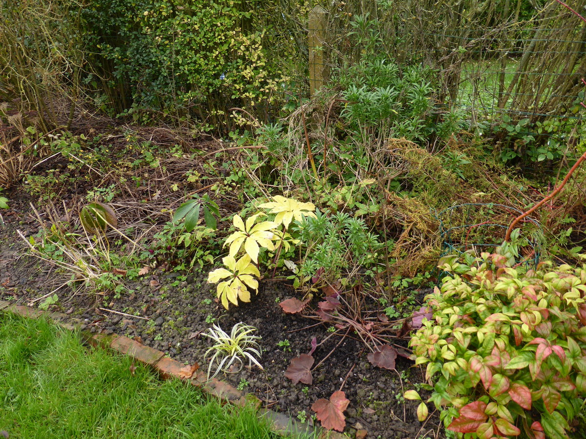 | Au début du massif le long de la haie, les bergenias apportent un peu de vert avec leur grandes feuilles ! | |