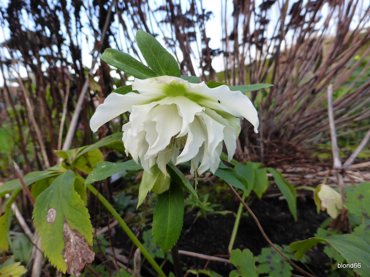 | De l'autre coté du massif, un semis du jardin : un joli hellebore double blanc | |