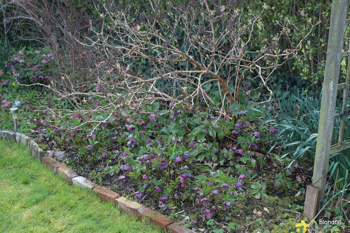 | Dans le massif Derrière la Piscine, les hellbores ont un peu colonisé le pied du forsythia. | |
