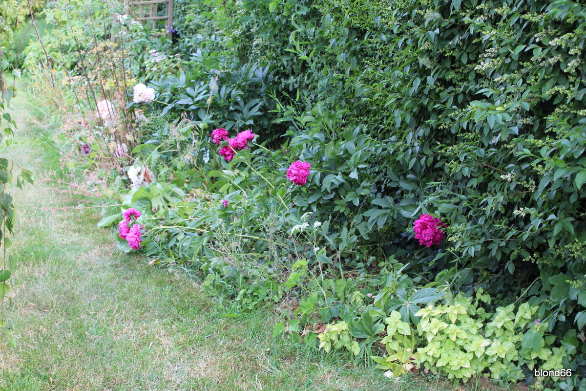 | Le long de la Haie, les pivoines animent le massif. | |