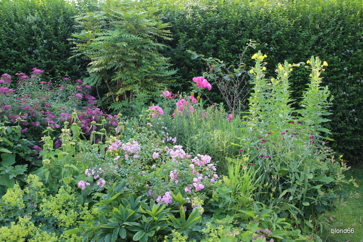 | Le massif au Seringat semble calme de loin. De près, les hémérocalles font le spectacle. | |