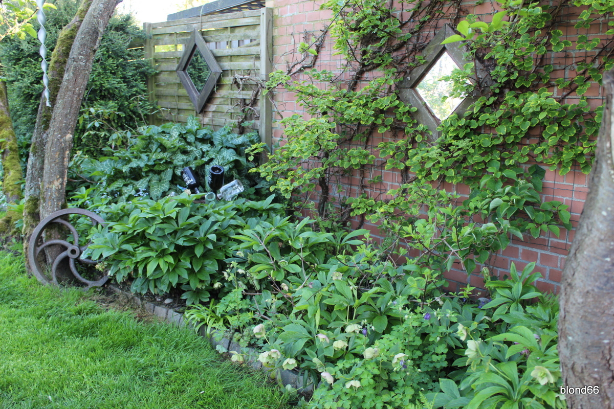 | Les hellebores animent encore le massif. | |