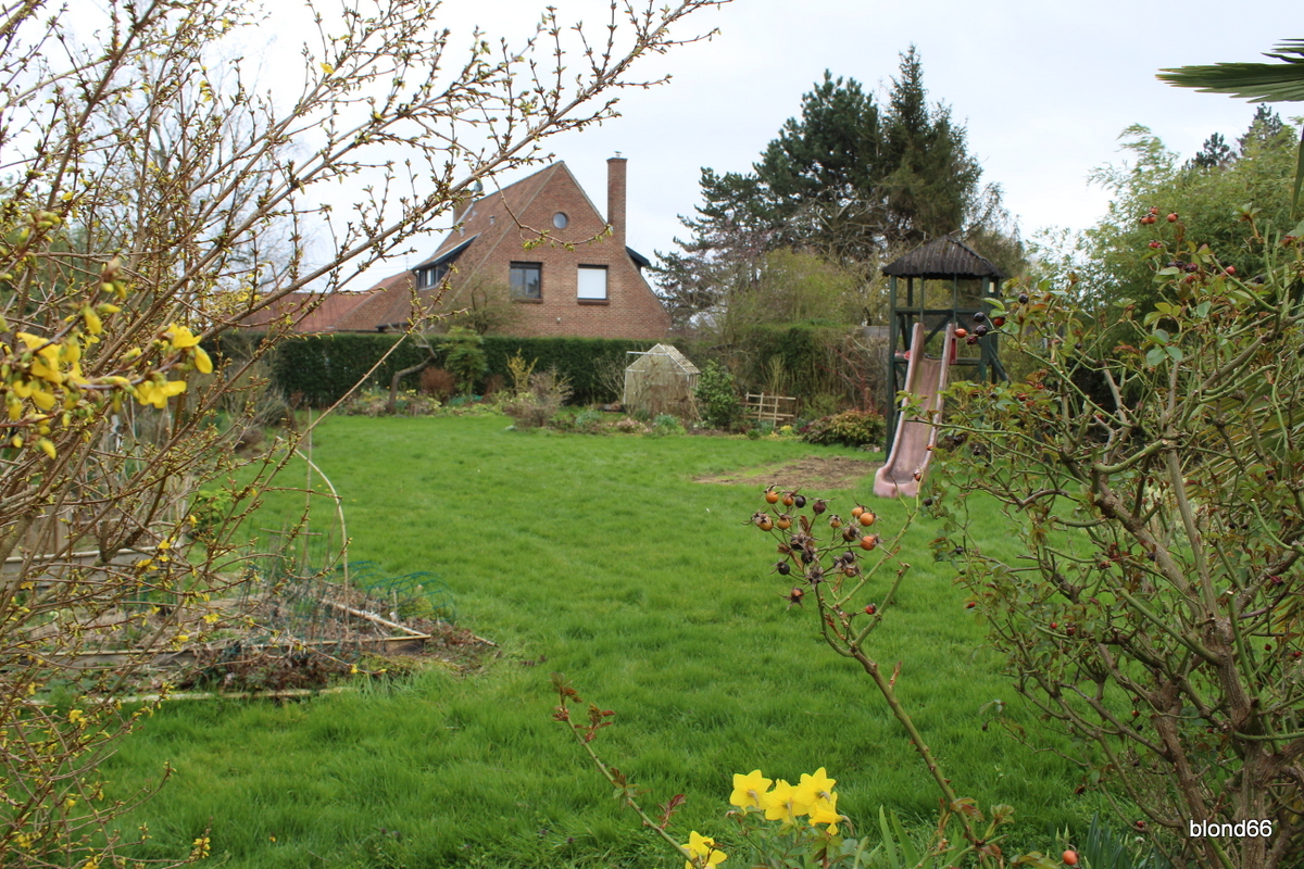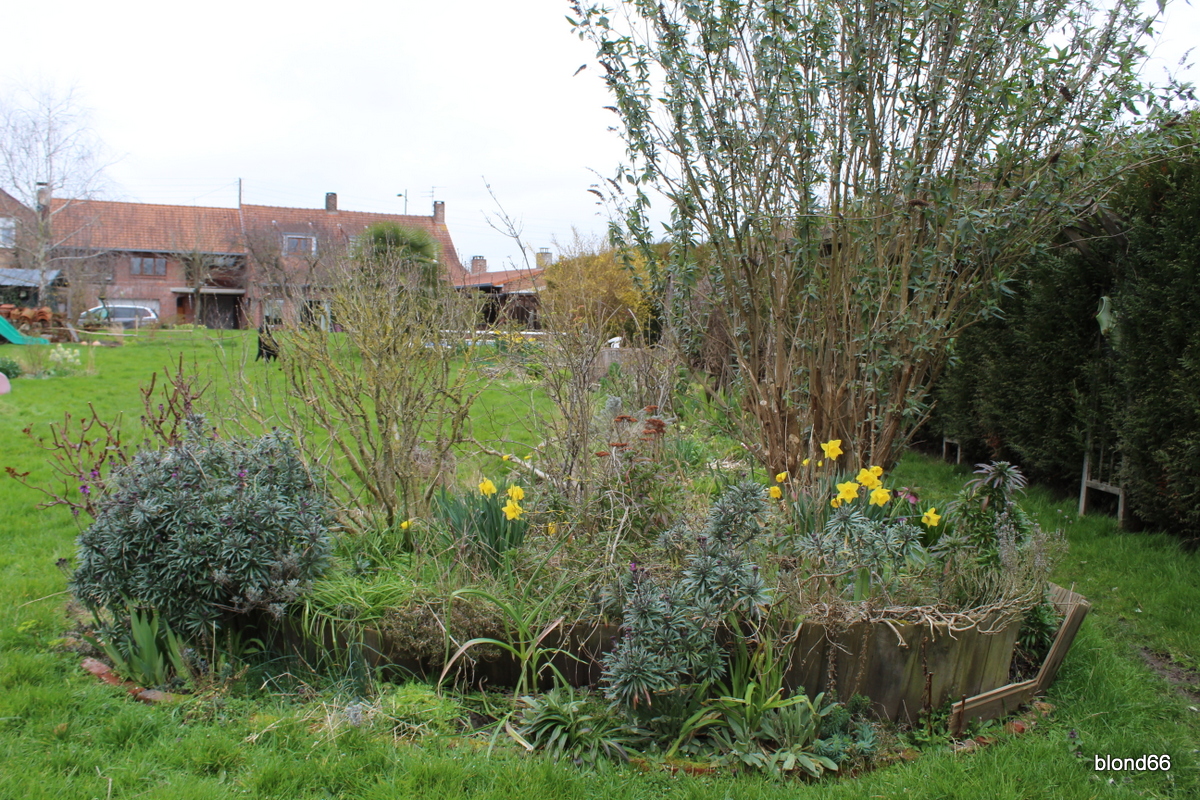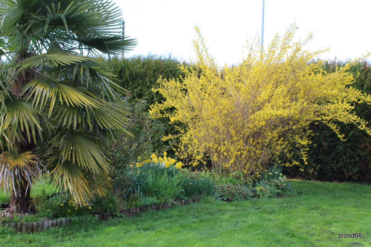 | Derrière la piscine est bien coloré. Le forsythia est prêt à exploser. | |